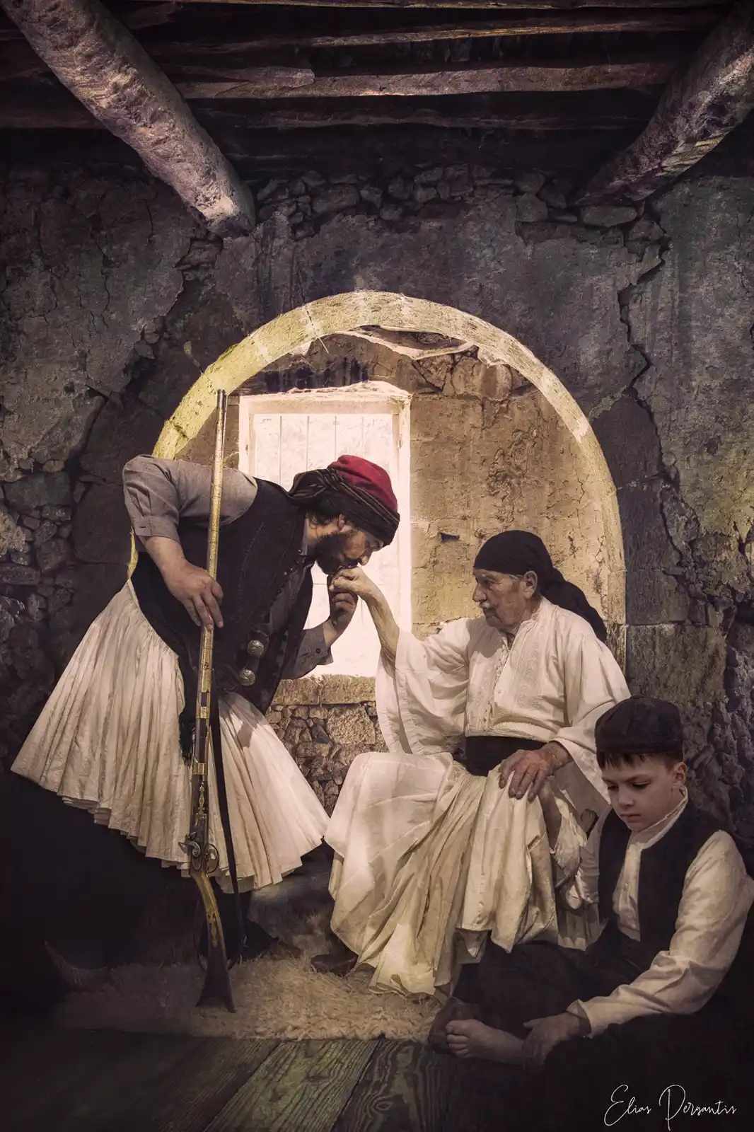 Λίγο πριν πορευθεί προς το πεδίο της μάχης, ο αγωνιστής στέκεται απέναντι στον γέροντα πατέρα του. Με δέος και συγκίνηση σκύβει το κεφάλι, δεχόμενος την ιερή πατρική ευχή — ευχή που κουβαλά τη δύναμη του γένους, το βάρος της παράδοσης και την πίστη στον δίκαιο αγώνα. Εκείνη την ίδια ώρα, τα γυναικόπαιδα εγκαταλείπουν τα σπιτικά τους και ανηφορίζουν προς τον Προφήτη Ηλία και το Μαλαγάρι, αναζητώντας ασφάλεια μακριά από την επερχόμενη απειλή. Η ατμόσφαιρα είναι βαριά από προσμονή· όλοι γνωρίζουν πως το επόμενο βήμα μπορεί να σφραγίσει για πάντα το μέλλον και τη λευτεριά τους.